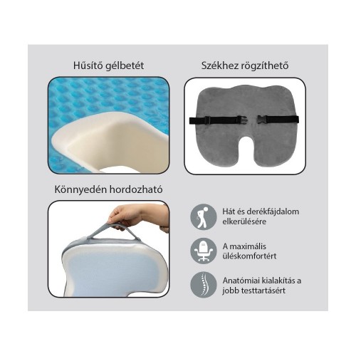 A memóriahabos anatómiai ülőpárna segít elkerülni, illetve enyhíteni a deréktájban keletkező nyomást. A memóriahab felveszi a test formáját és lassan veszi fel az eredeti alakját újra. Segítségével a gerincoszlop felveszi az optimális ívét, tehermentesítve ezzel az ízületeket és az izmokat. Kényelmes, ugyanakkor biztos tartást ad a gerincoszlopnak. Kifejezetten ajánlott azok számára, akik nap, mint nap ülőmunkát végeznek, illetve a derékfájással küzdőknek. A párna könnyedén hordozható a rávarrt fülnek köszönhetően. Az állítható, csattal ellátott pánt segítségével a székhez rögzíthető.